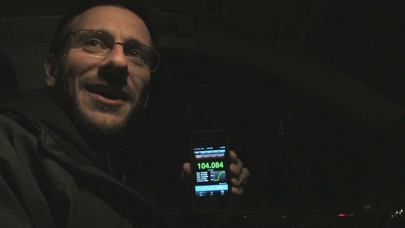 Daniel Mross checking the current bitcoin price using an app on his phone in a scene from the documentary The Rise and Rise of Bitcoin by filmmaker Nicholas Mross.