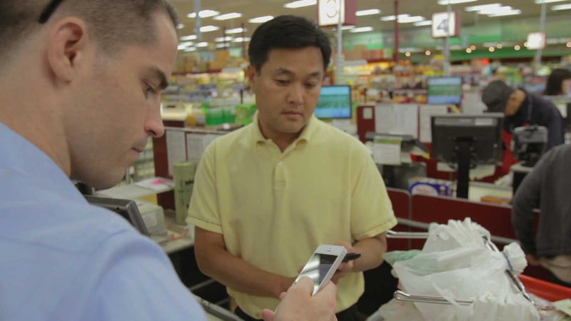 Roger Ver walking a Korean supermarket owner through his first bitcoin transaction in a scene from the documentary The Rise and Rise of Bitcoin by filmmaker Nicholas Mross.